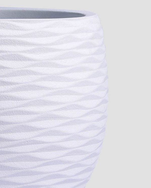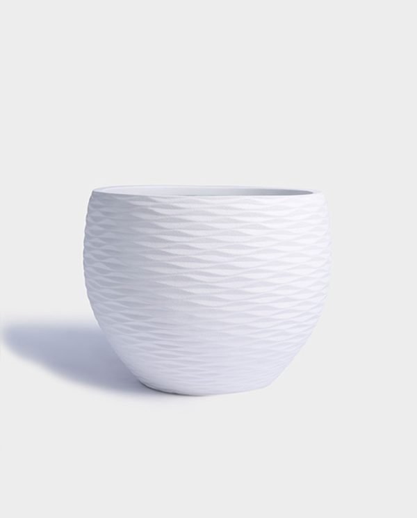 This medium-sized geometric fiberglass planter featuring a modern round bowl-like shape. The striking geometric design, adds a touch of modern sophistication to any setting